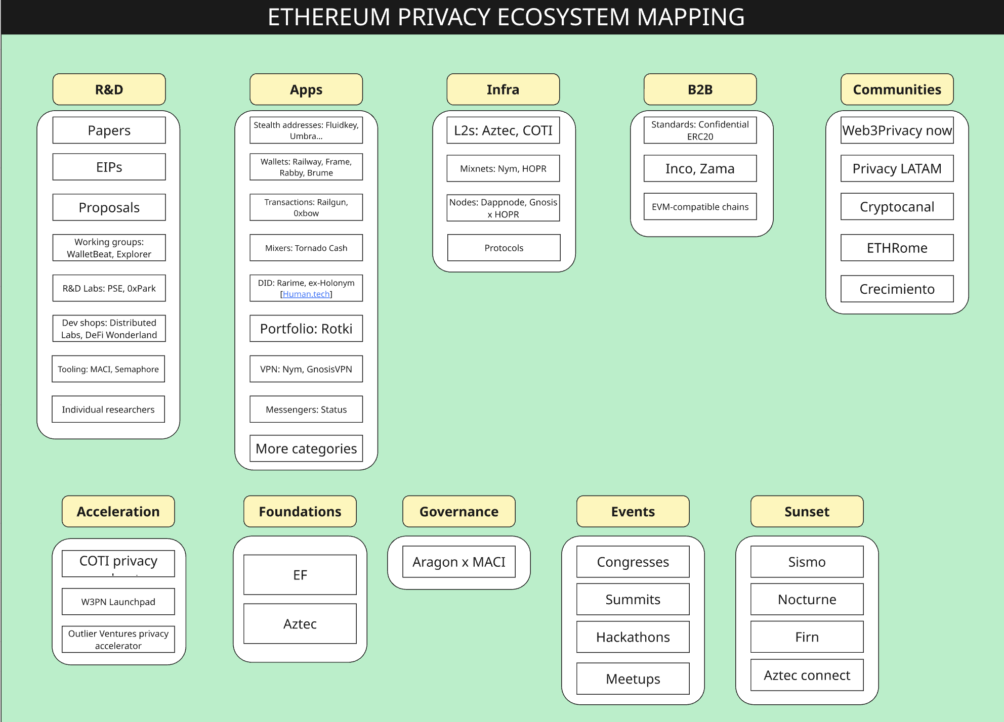 Fill existing knowledge gap: Create an actionable map structuring global players delivering privacy in Ethereum from L2s like Aztec to local Privacy LATAM communities.
